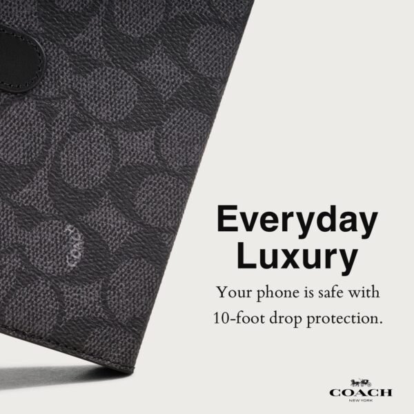 Signature required— the Coach Folio Case in Signature C for iP 15 Pro holds all your essentials in a sleek design. Featuring 3 card slots and a pocket for cash. you can carry your essentials in a removable folio case. Bring luxury to your everyday accessory with a 10ft drop protection and thin case profile that doesn’t interfere with wireless charging.