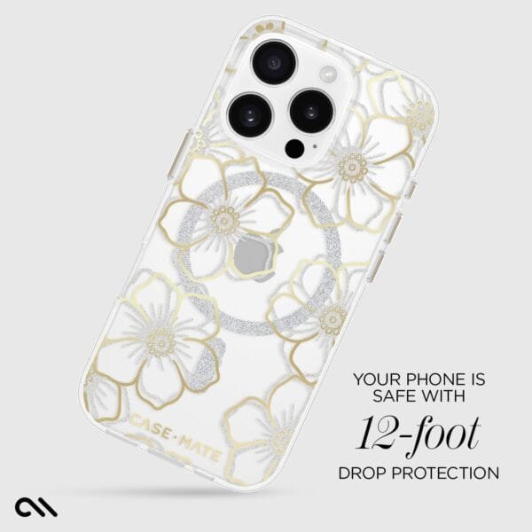 Beautiful florals are in the palm of your hand with the Floral Gems MagSafe Phone Case for the iP 16 Pro! This classic case stands out with a shimmering floral design and gemstone accents. while strong built-in magnets allow for easy MagSafe accessorizing and charging. We know how much you love your phone. so feel confident knowing it’s safe with 12-foot drop protection.