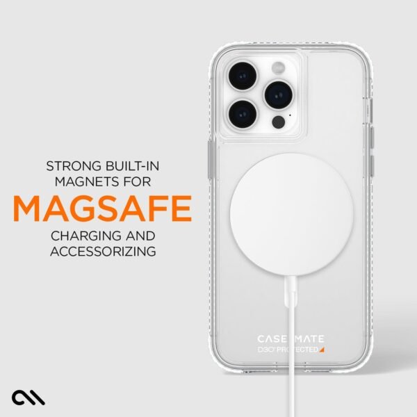 Stay strong. stay protected. The Tough D3O® Clear case is built to last day and night for ultra-strong phone protection. D3O® uses a self-strengthening. non-Newtonian technology that offers the thinnest. strongest. and the world’s best impact protection. The science behind this material is incredible– so yes. you can really drop it. With addedD3O® protection. feel confident your phone is safe with 16-foot drop protection. Strong built-in magnets allow for easy MagSafe accessorizing and charging.